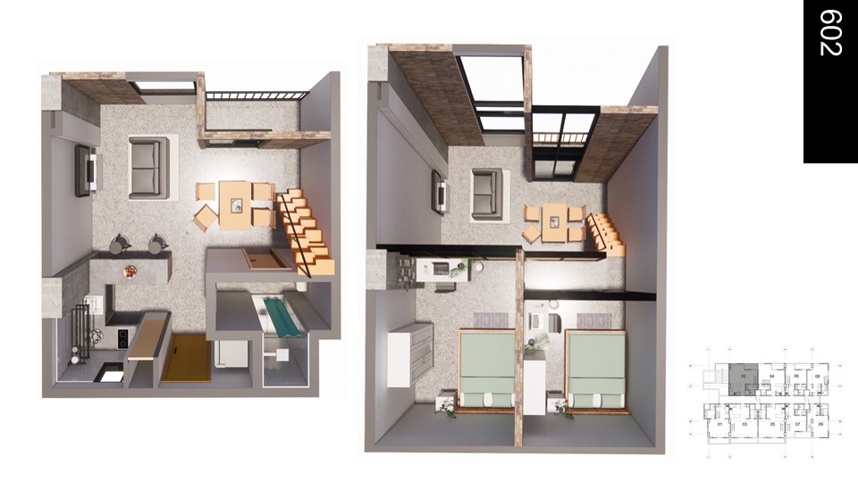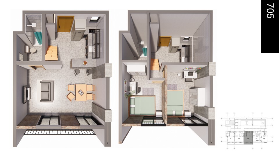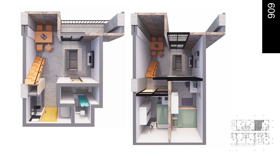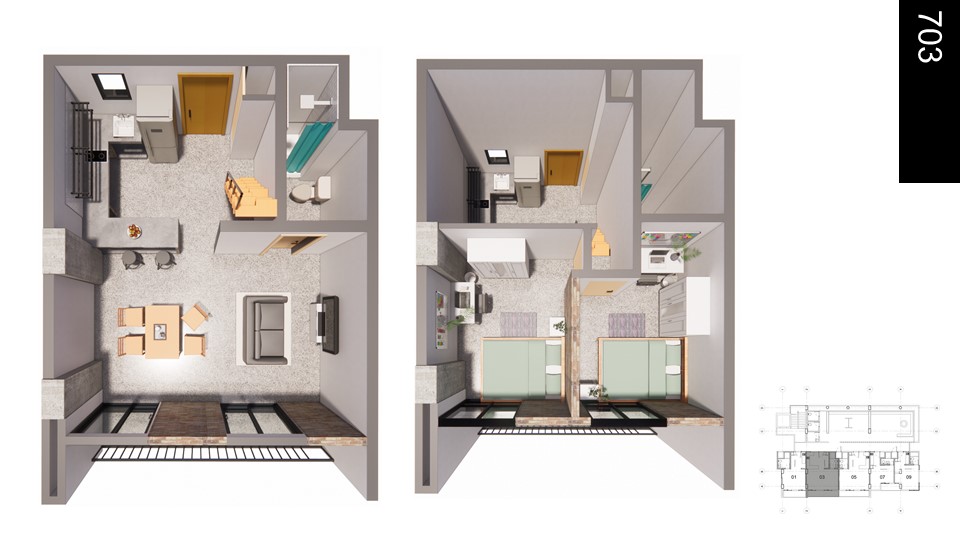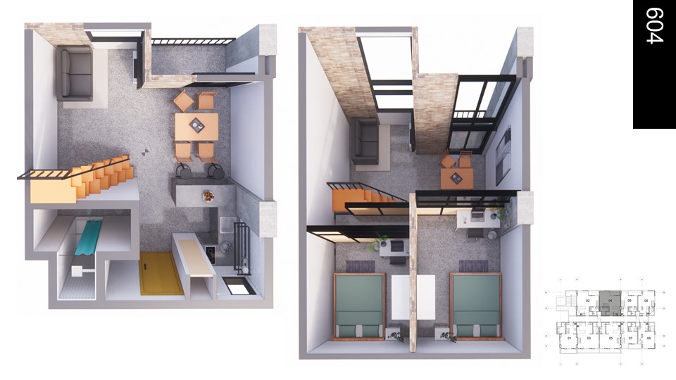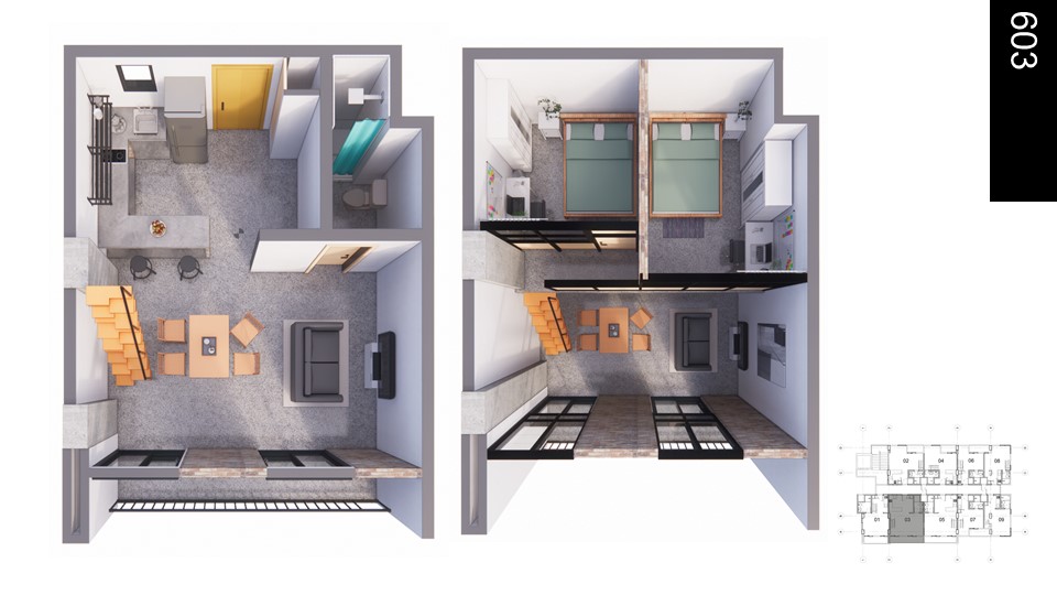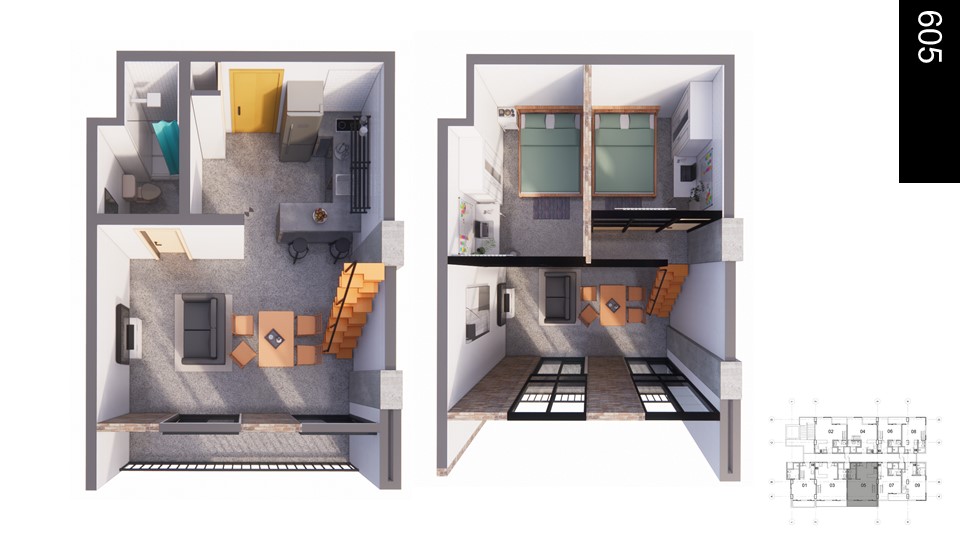 Espacio para dos personas, mide 45 m2 parte parte inferior y 35 m2 parte de superior. Cuenta con cocina equipada con refrigerador, parrilla de inducción y comedor con 4 sillas. Todos están amueblados con dos camas matrimoniales, dos escritorios con silla, dos mesas de noche y dos armarios. El precio depende del paquete a elegir, modelo a elegir y el piso en el que se encuentra.